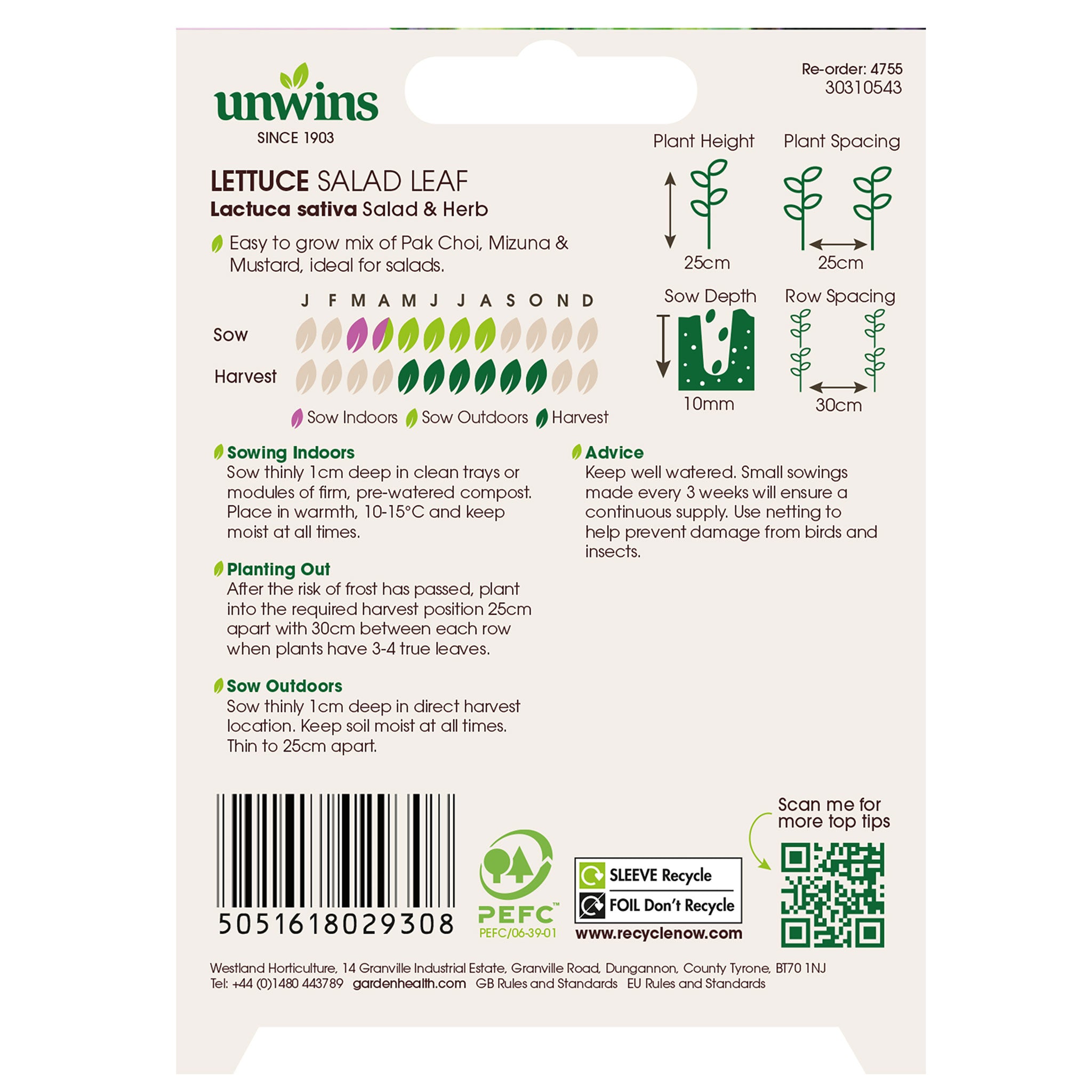 Unwins Lettuce Salad Leaf Seeds is an easy to grow mix of Pak Choi, Mizuna and Mustard.