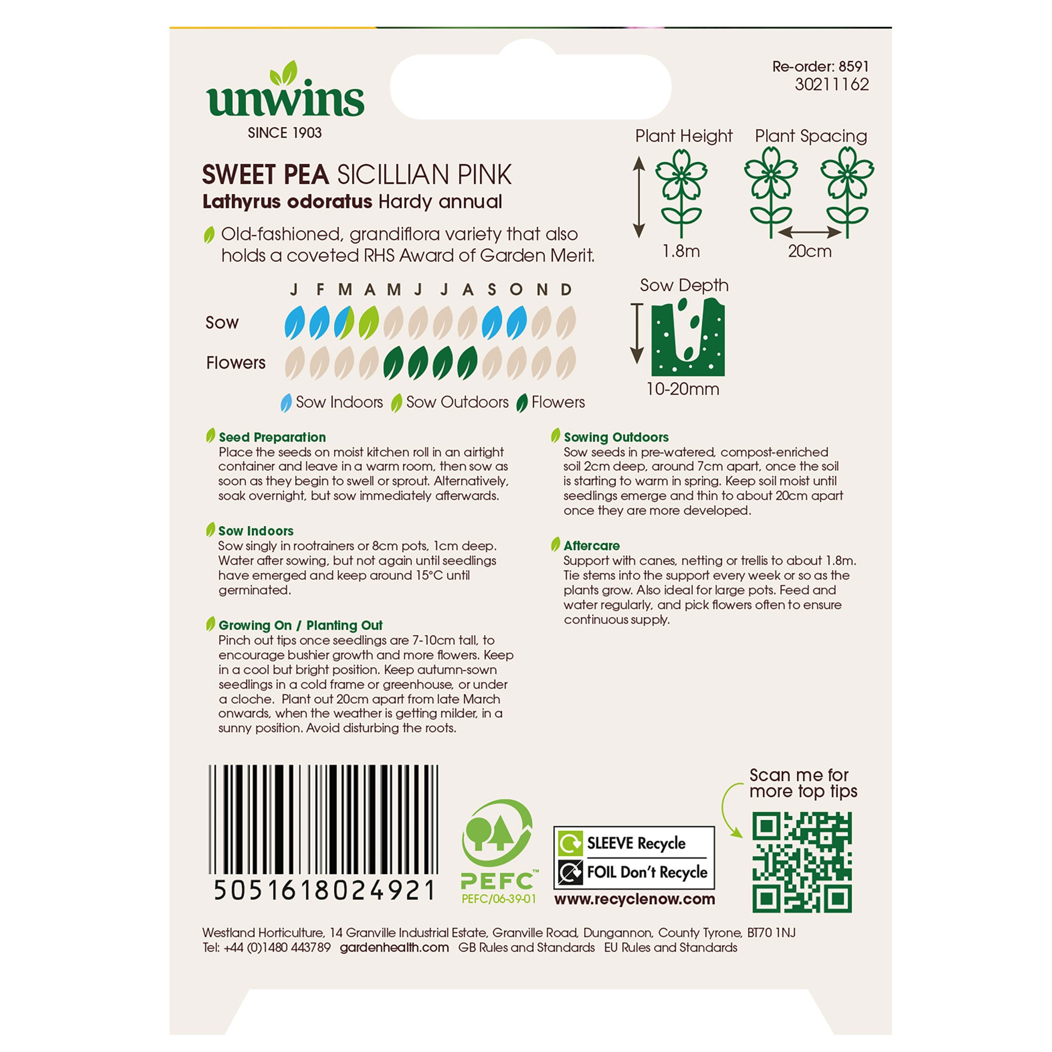 Unwins Sweet Pea Sicilian Pink Seeds will give you masses of pink bicolour cerise and pink flowers. These Sweet Peas are highly scented.